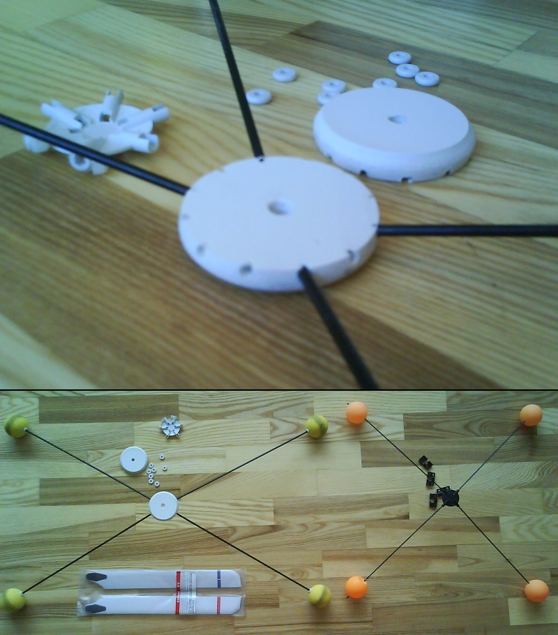 * 2 stiprūs (turbūt nesulaužomi) CNC staklėmis pagaminti centrai, kiekviename po 12 skylių, kas 30 laipsnių. Taigi, strypus galima sudėti ir 60 + 120 ir po 90 laipsnių;