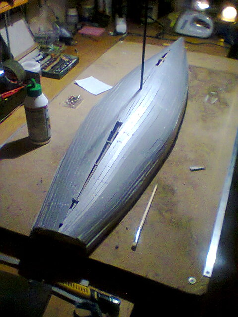 Gaunasi kažkas tokio. Truputuką pritrukau klijų ir dabar reiks pasiieškoti lengvai šveičiamo špakliaus. Danktį sandarinsiu magnetukų pagalba. Veleną dariau iš plieninio 6 mm stripo ir senovėj buvau pirkes aliuminio vamzdelį, kuris kaip tik tiko. Variklis pritaikytas propereliui sukti, todėl padariau krumpliaračių perdavimą. Sraigtą iš lėktuvo propo, tik smarkiai apkarpiau, aišku koks bus greitis neaišku, svarbiausia, kad plauktų.